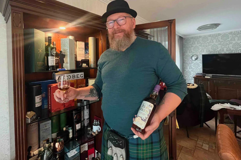 Dazu spielt er klassische schottische Musik auf dem Dudelsack.
